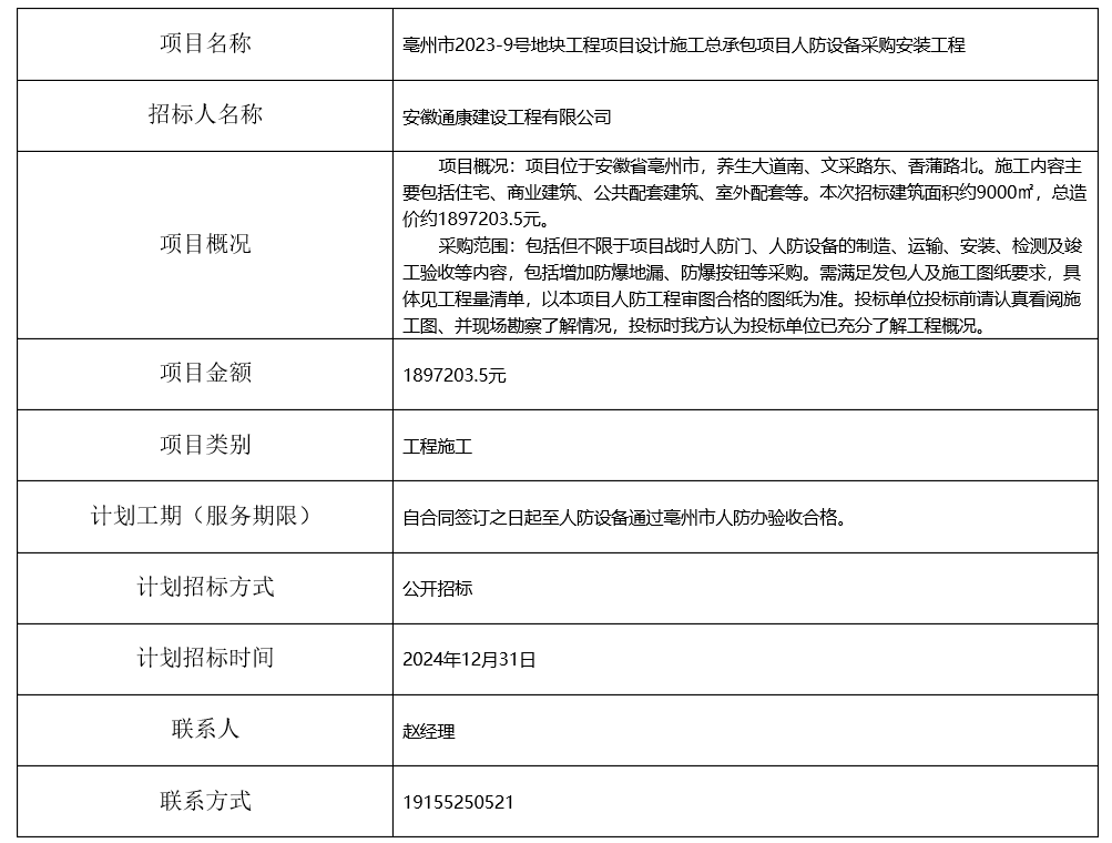 亳州市2023-9號地塊工程項目設(shè)計施工總承包項目人防設(shè)備采購安裝工程招標計劃