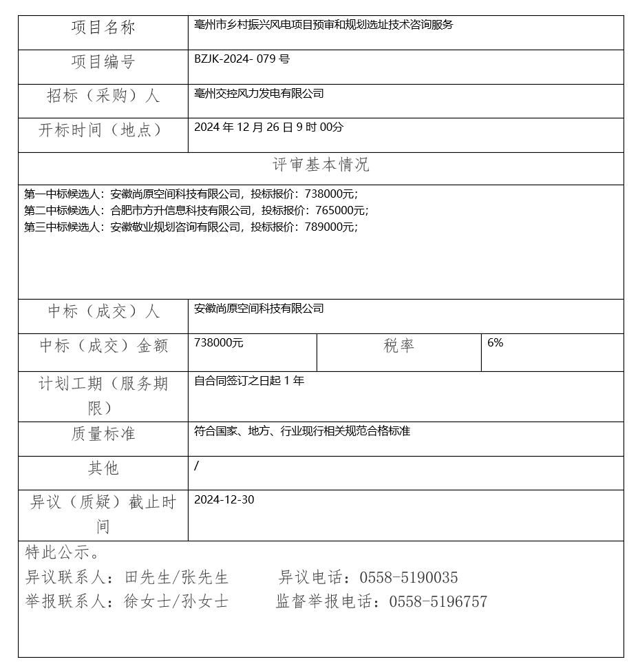 亳州市鄉(xiāng)村振興風(fēng)電項目預(yù)審和規(guī)劃選址技術(shù)咨詢服務(wù)中標(biāo)(成交)結(jié)果公示