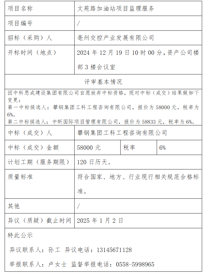 文苑路加油站項目監(jiān)理服務中標結果變更公示