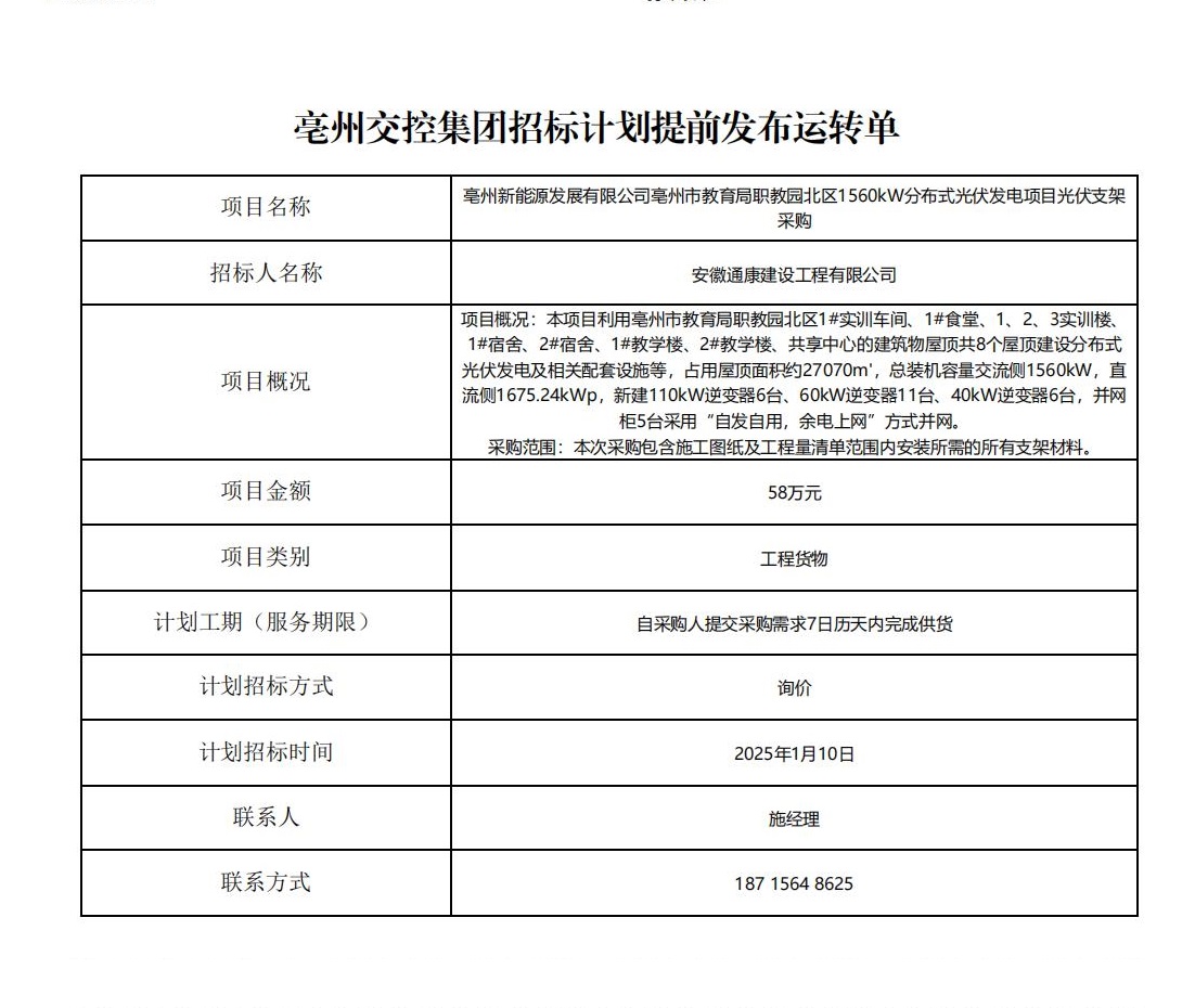 亳州新能源發(fā)展有限公司亳州市教育局職教園北區(qū)1560kW分布式光伏發(fā)電項目光伏支架采購招標計劃