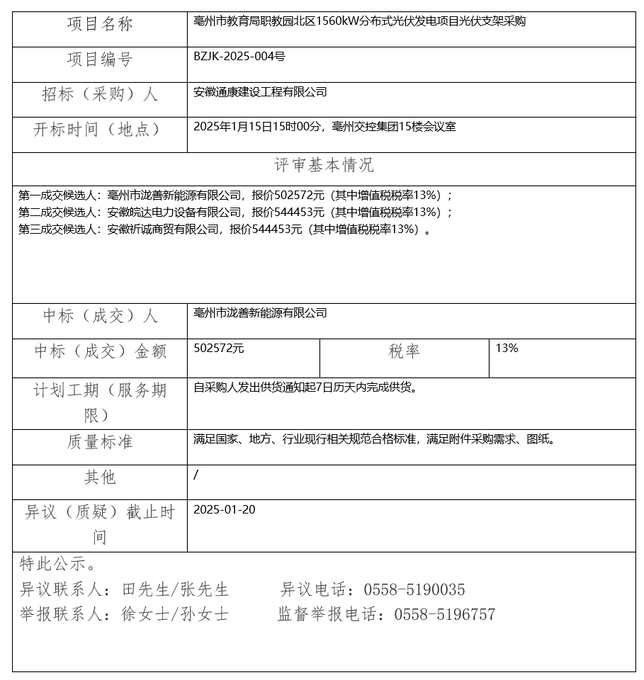 亳州市教育局職教園北區(qū)1560kW分布式光伏發(fā)電項(xiàng)目光伏支架采購(gòu)中標(biāo)(成交)結(jié)果公示