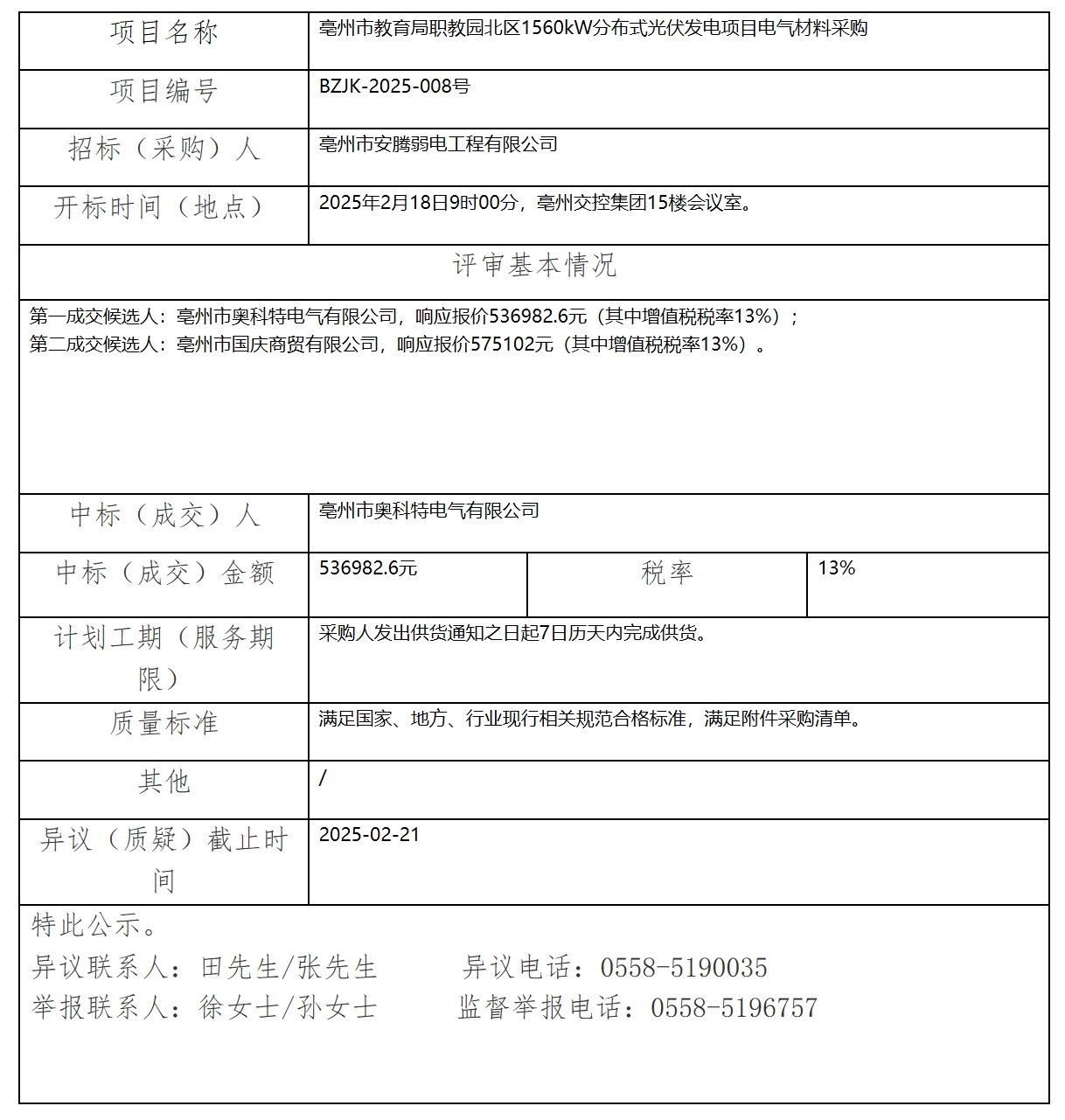 亳州市教育局職教園北區(qū)1560kW分布式光伏發(fā)電項(xiàng)目電氣材料采購(gòu)中標(biāo)(成交)結(jié)果公示