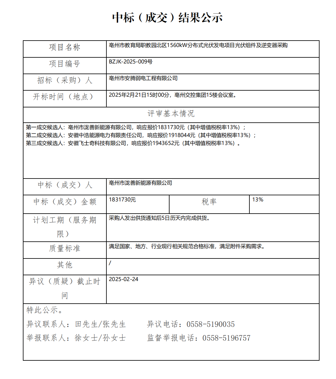 亳州市教育局職教園北區(qū)1560kW分布式光伏發(fā)電項(xiàng)目光伏組件及逆變器采購中標(biāo)(成交)結(jié)果公示
