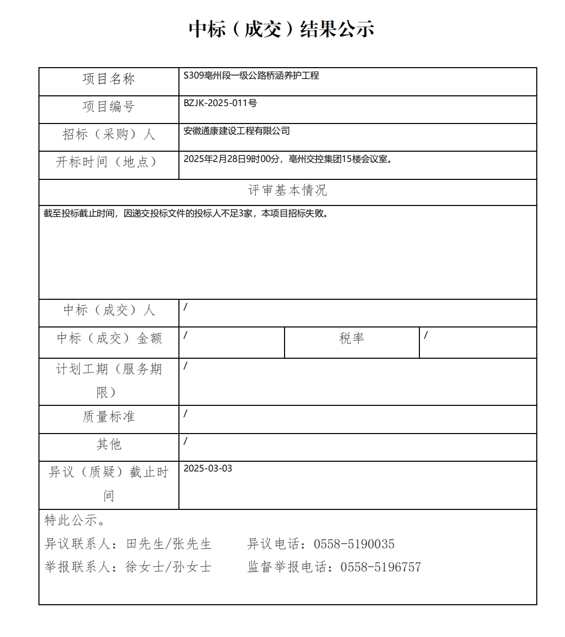 S309亳州段一級(jí)公路橋涵養(yǎng)護(hù)工程中標(biāo)(成交)結(jié)果公示
