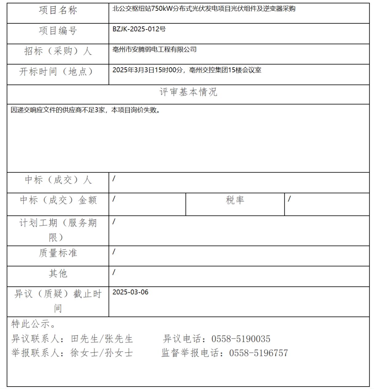 北公交樞紐站750kW分布式光伏發(fā)電項目光伏組件及逆變器采購中標(成交)結(jié)果公示