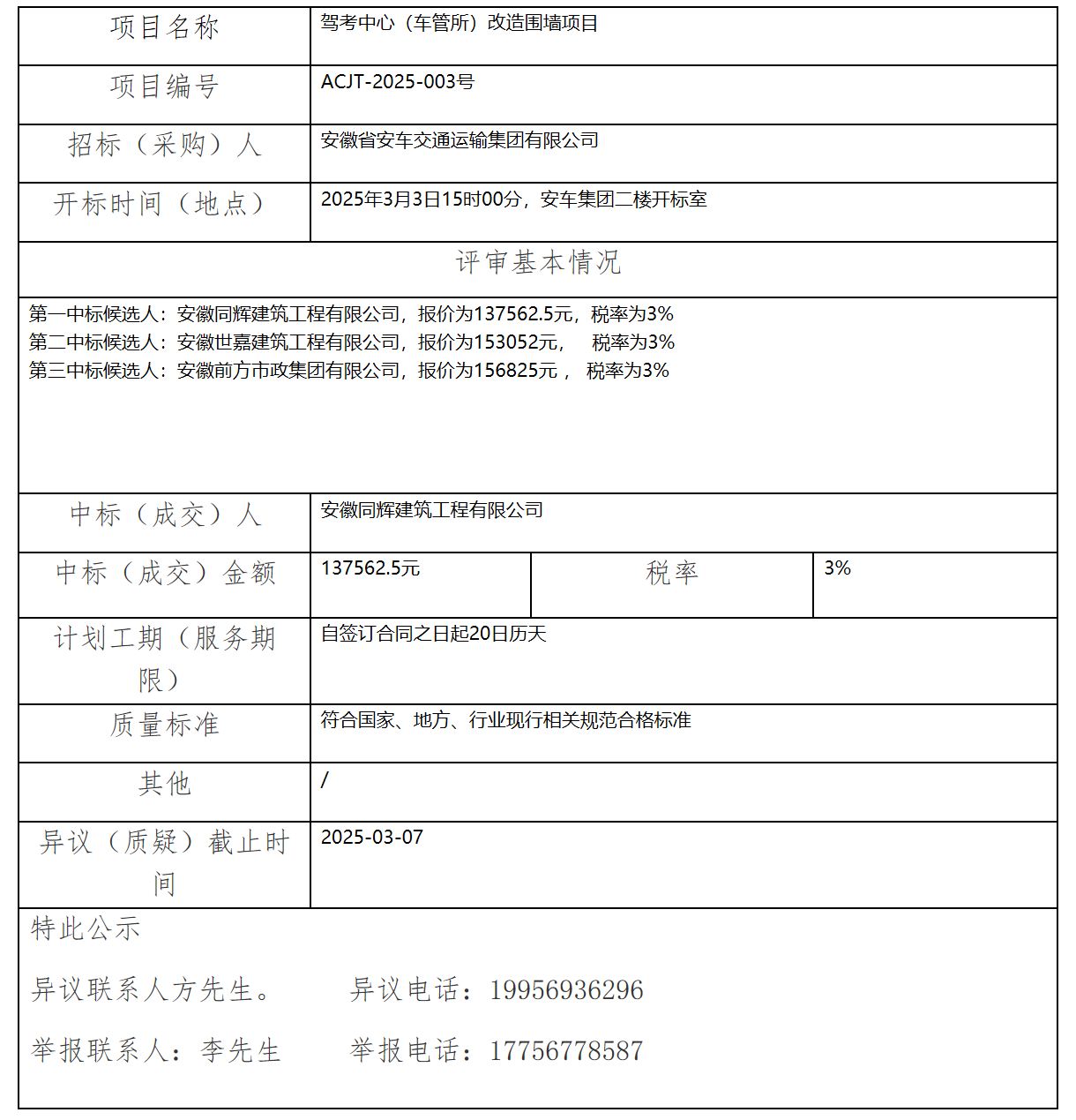 駕考中心(車管所)改造圍墻項目中標(成交)結(jié)果公示