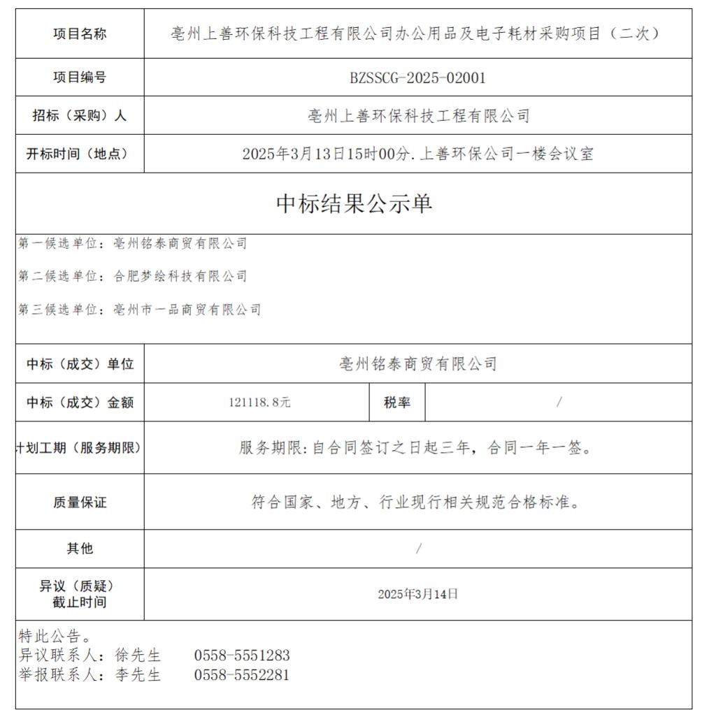 亳州上善環(huán)保科技工程有限公司辦公用品及電子耗材采購項目(二次)中標結(jié)果公示