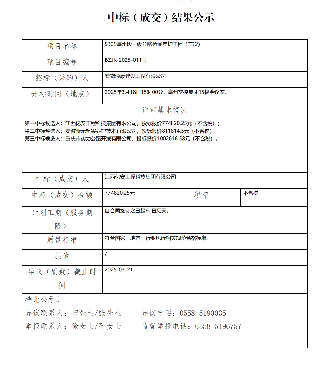 S309亳州段一級公路橋涵養(yǎng)護(hù)工程(二次)中標(biāo)(成交)結(jié)果公示