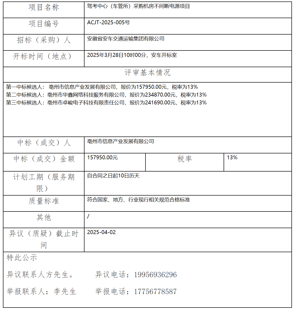 駕考中心(車管所)采購機(jī)房不間斷電源項(xiàng)目中標(biāo)(成交)結(jié)果公示