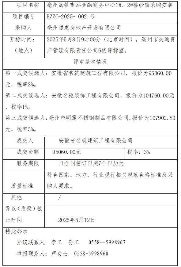 亳州高鐵南站金融商務(wù)中心1#、2#樓紗窗采購安裝成交結(jié)果公示