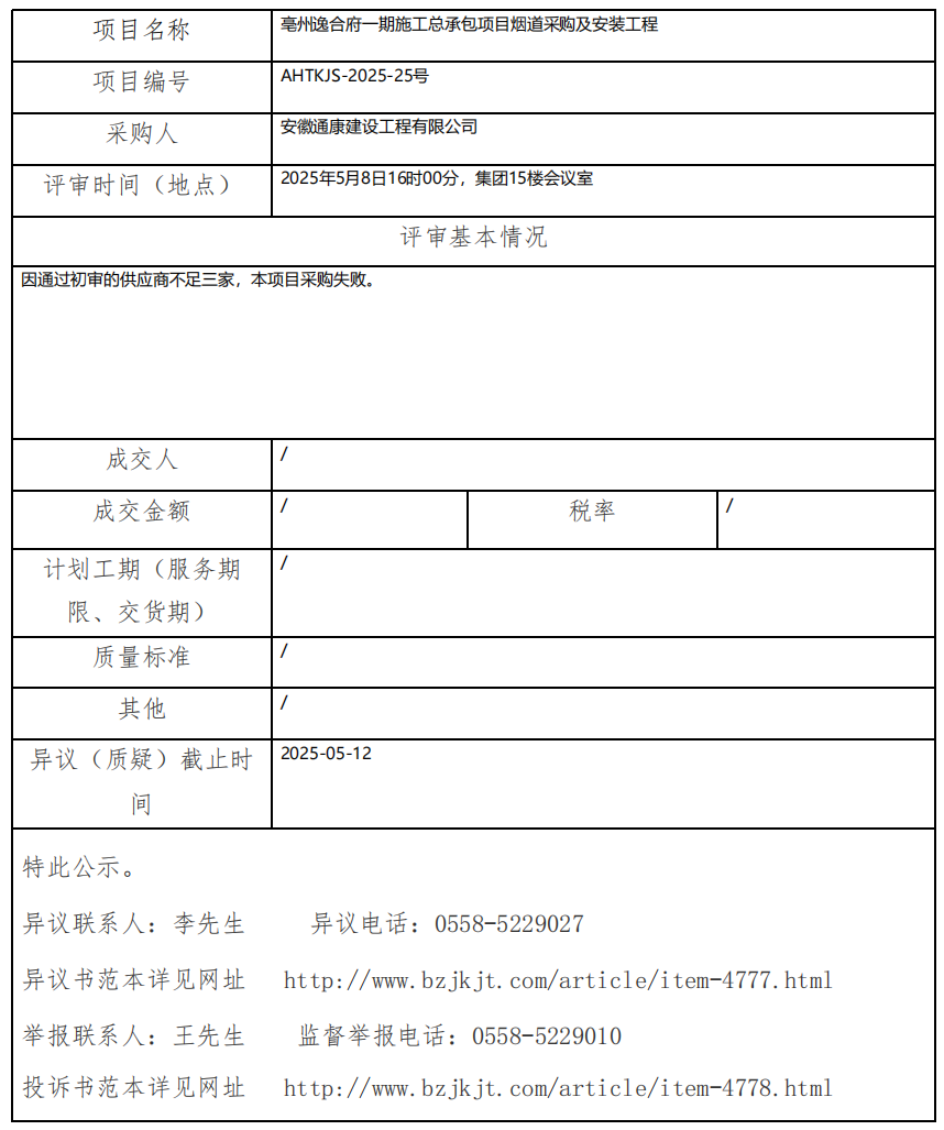亳州逸合府一期施工總承包項目煙道采購及安裝工程成交結(jié)果公示