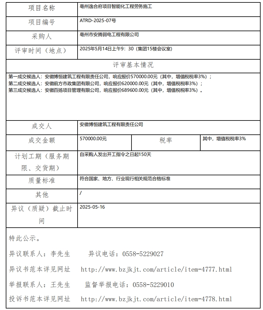 亳州逸合府項(xiàng)目智能化工程勞務(wù)施工成交結(jié)果公示