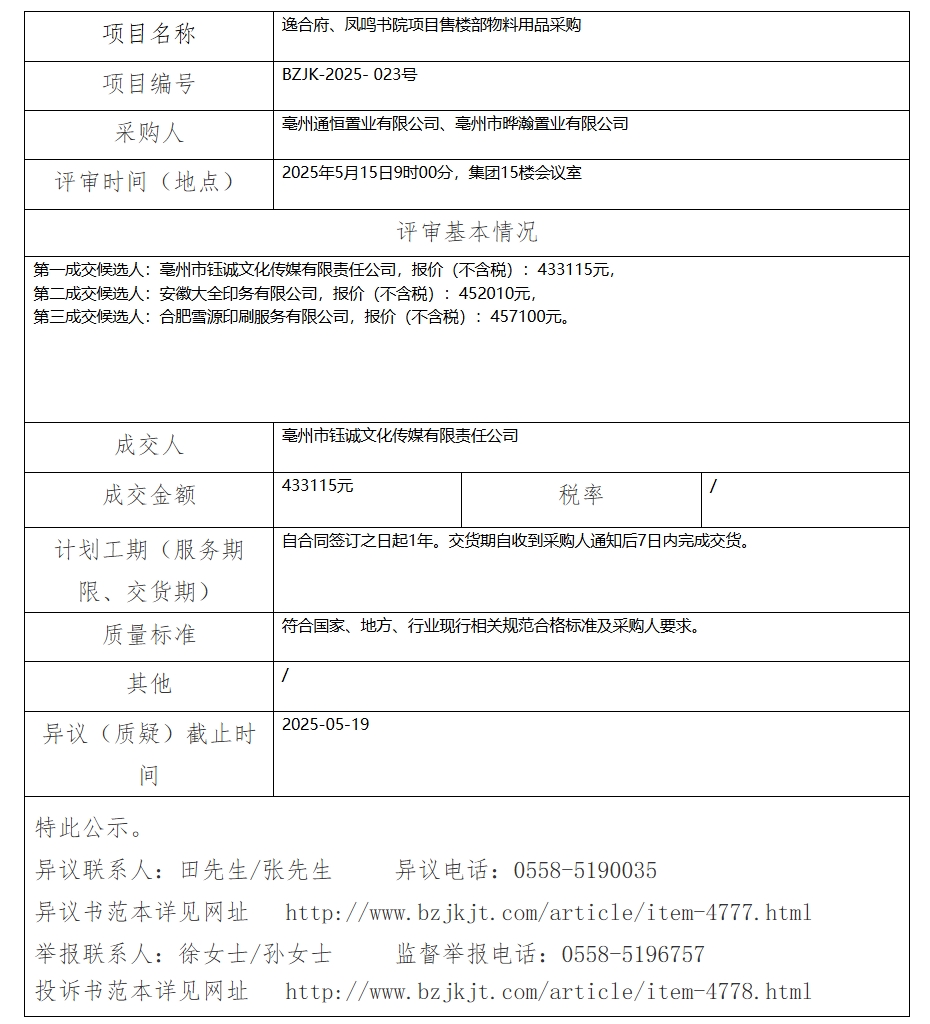 逸合府、鳳鳴書院項目售樓部物料用品采購成交結(jié)果公示