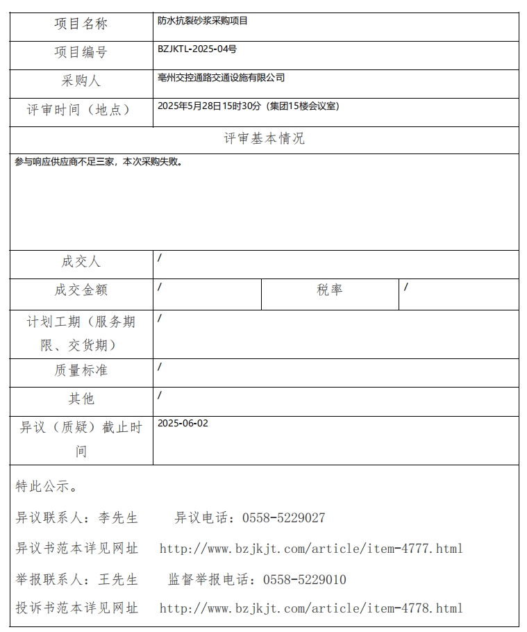 防水抗裂砂漿采購項目成交結(jié)果公示