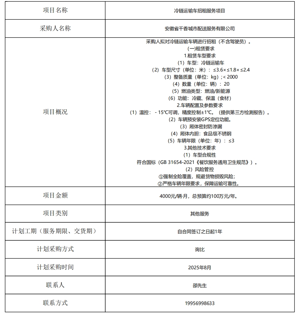冷鏈運輸車招租服務(wù)項目采購計劃