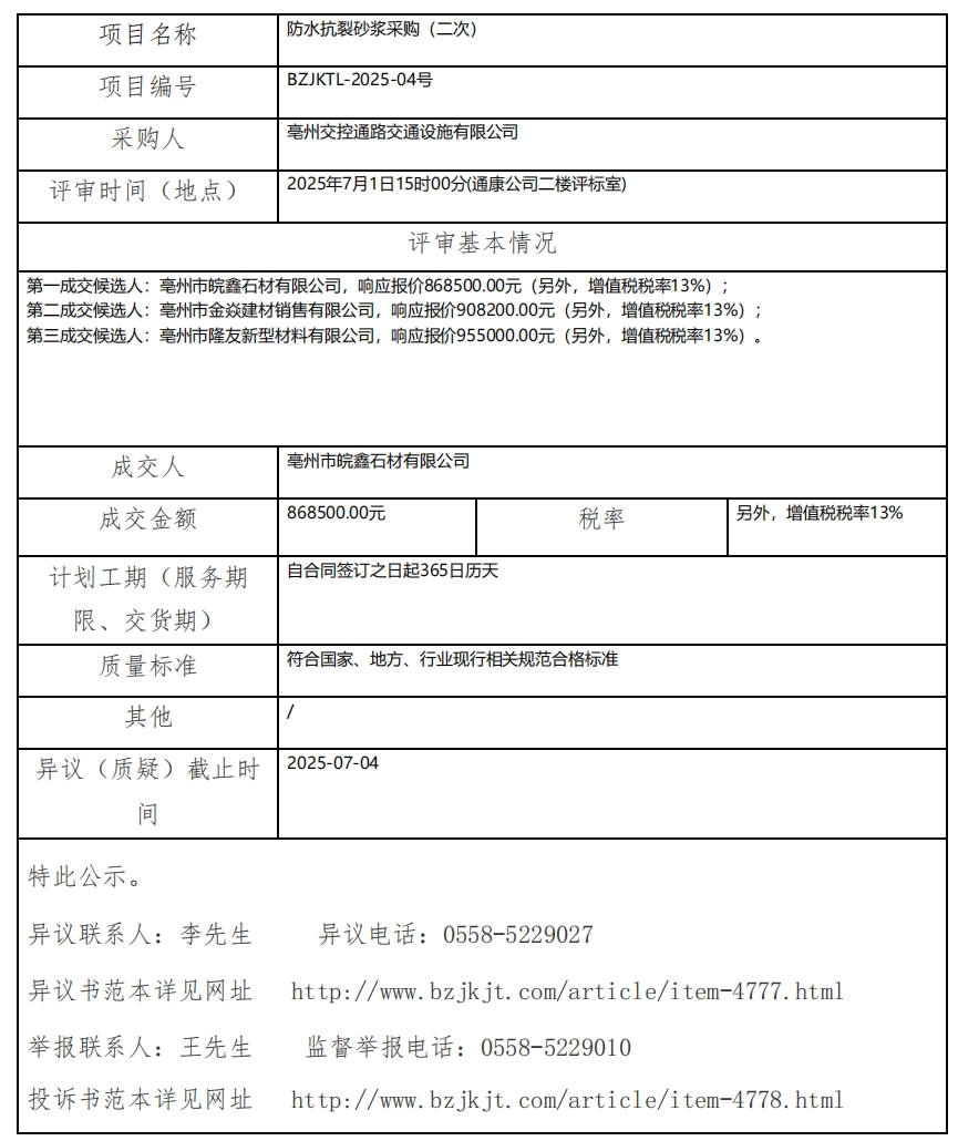 防水抗裂砂漿采購(gòu)(二次)成交結(jié)果公示