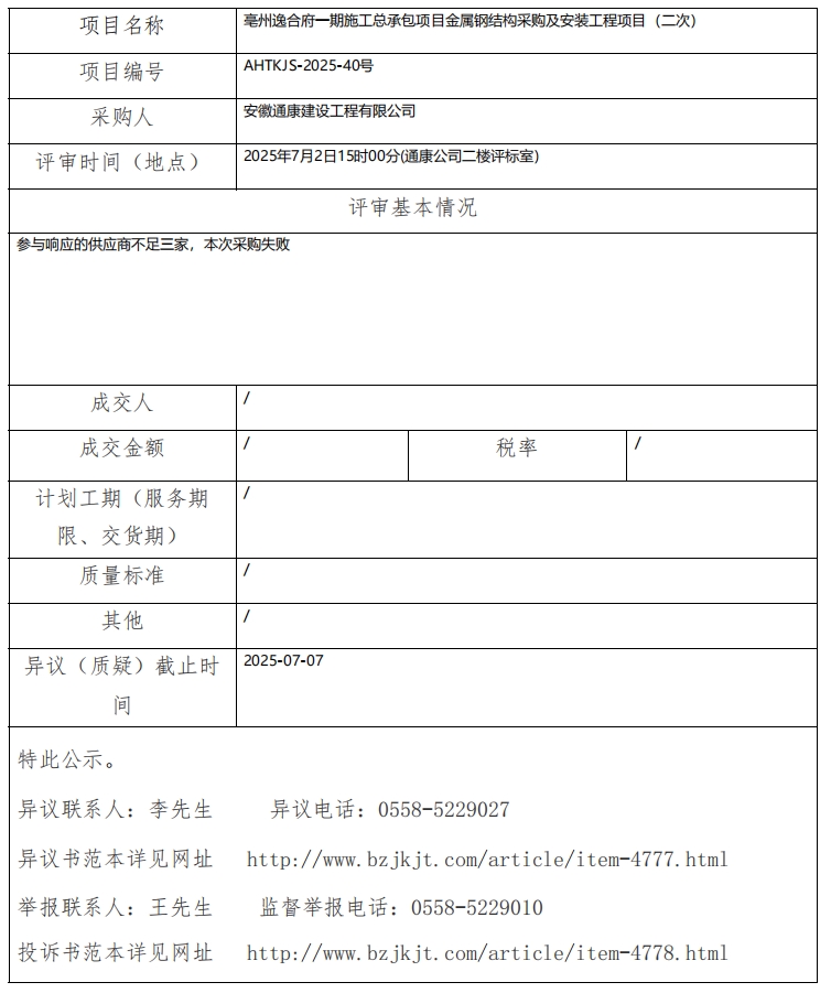 亳州逸合府一期施工總承包項(xiàng)目金屬鋼結(jié)構(gòu)采購(gòu)及安裝工程項(xiàng)目(二次)成交結(jié)果公示
