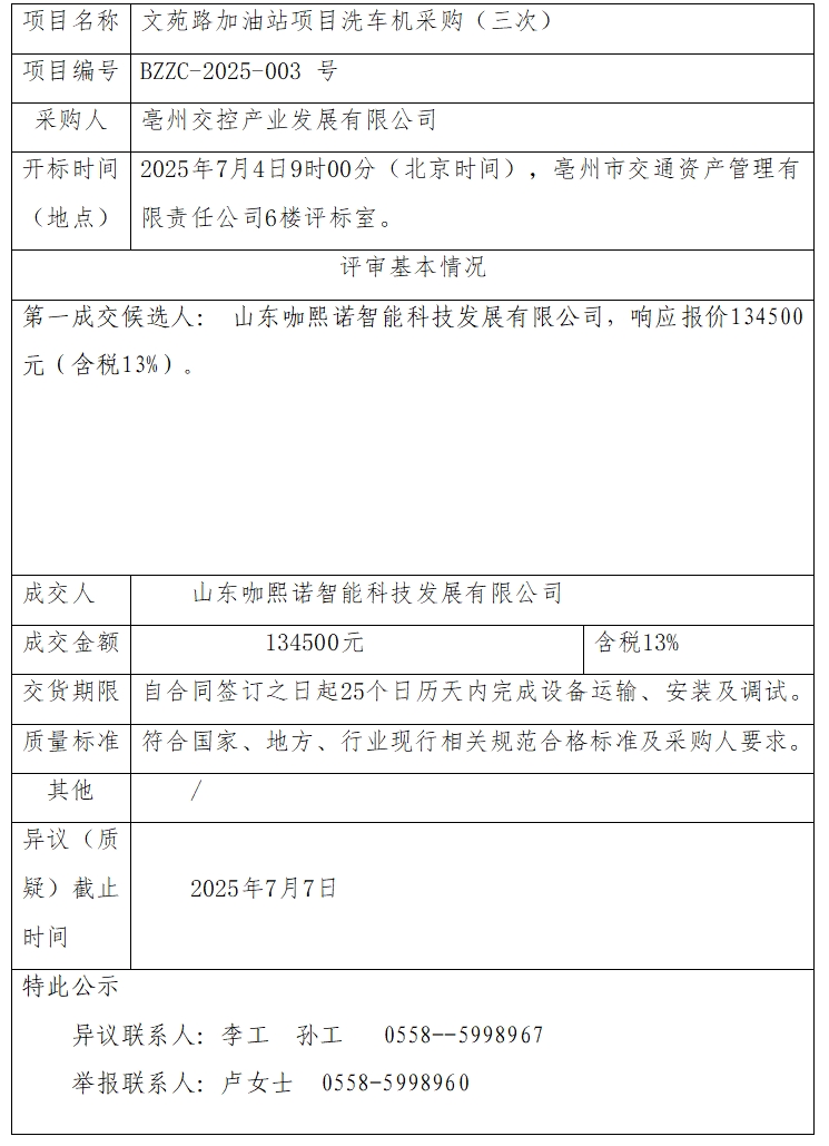 文苑路加油站項目洗車機(jī)采購(三次)成交結(jié)果公示