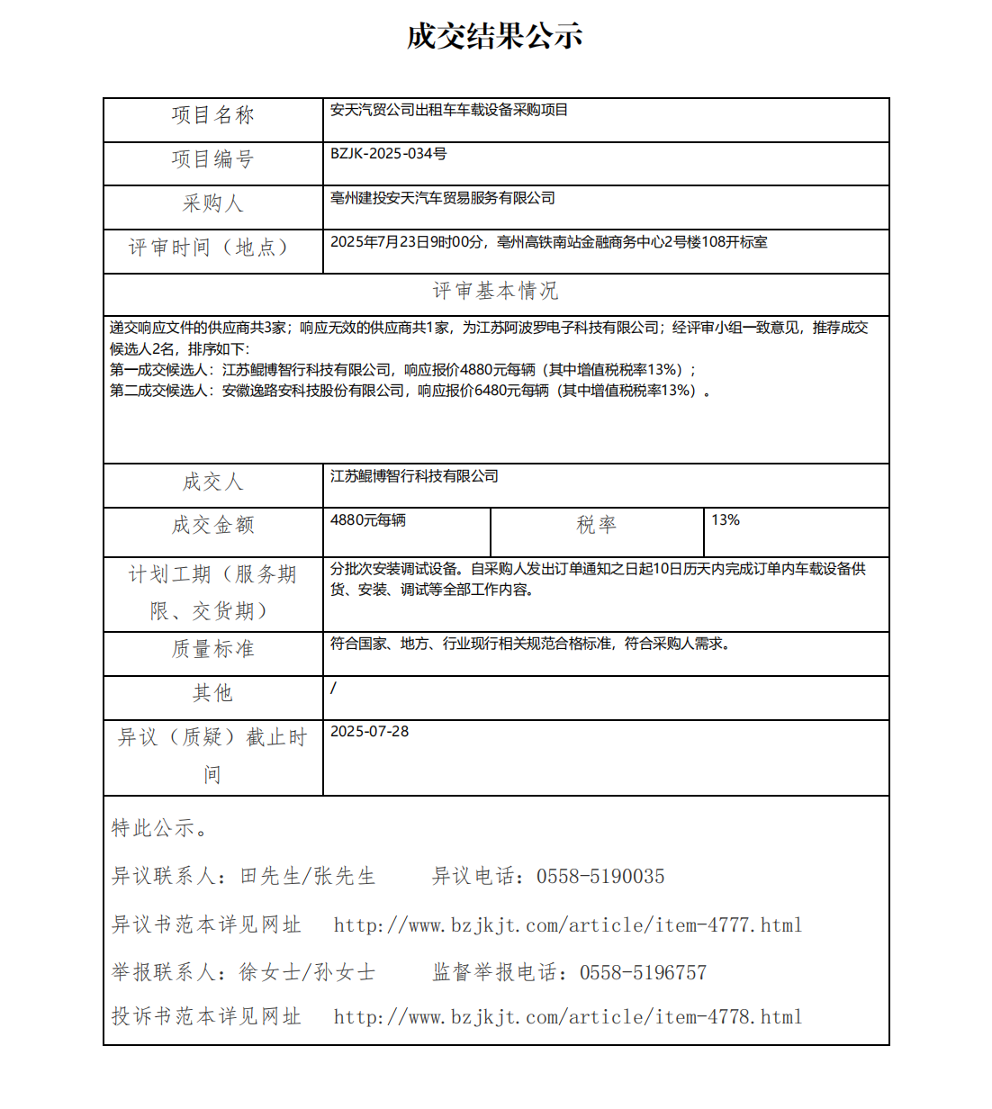 安天汽貿(mào)公司出租車車載設(shè)備采購項(xiàng)目成交結(jié)果公示