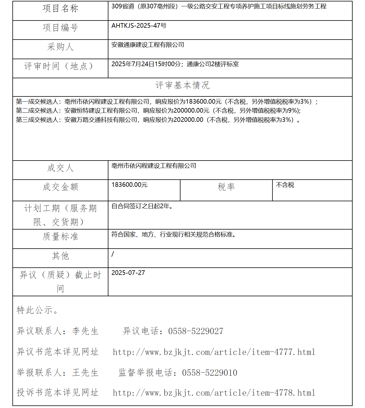 309省道(原307亳州段)一級公路交安工程專項養(yǎng)護(hù)施工項目標(biāo)線施劃勞務(wù)工程成交結(jié)果公示