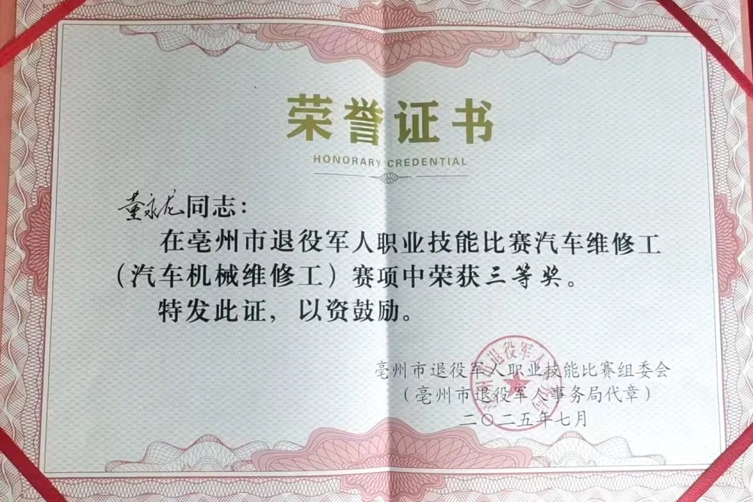 近日,安行天下駕校董永龍同志憑借扎實(shí)的專業(yè)知識、精湛的實(shí)操技能和穩(wěn)定的心理素質(zhì),在安徽省第三屆退役軍人職業(yè)技能大賽亳州市選拔賽“汽車維修工”賽項(xiàng)中脫穎而出,榮獲三等獎。