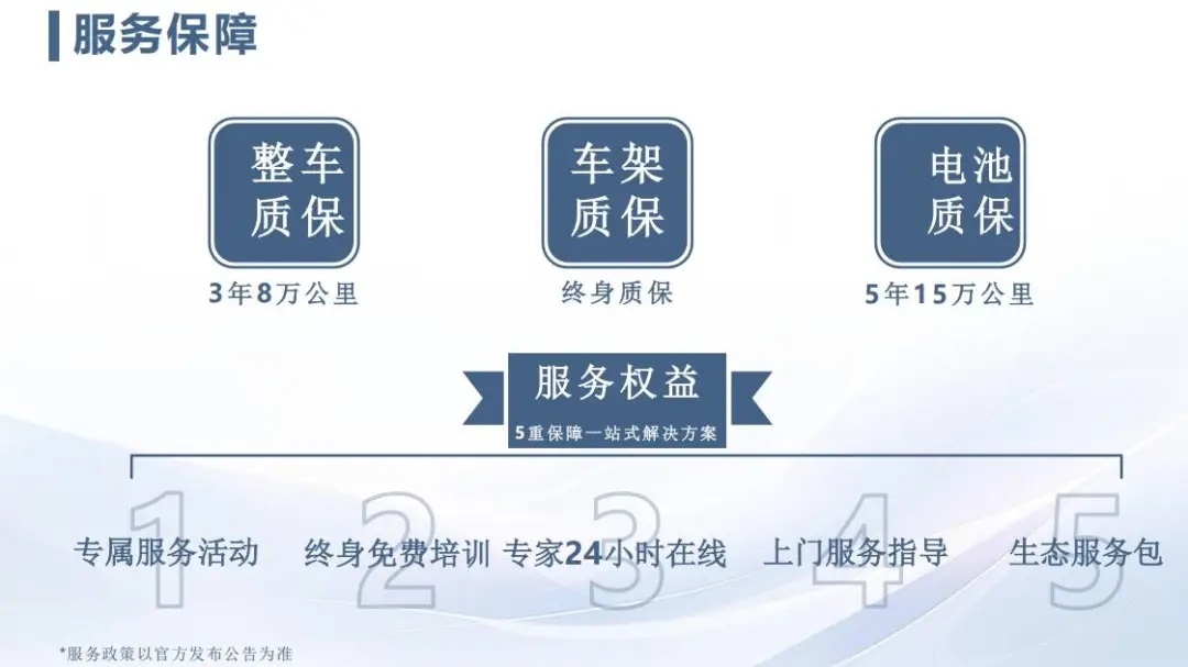 專屬質(zhì)保終身守護(hù),整車保修期3年或8萬(wàn)公里;動(dòng)力電池保修期5年或15萬(wàn)公里;車架2年包換,終身包修。