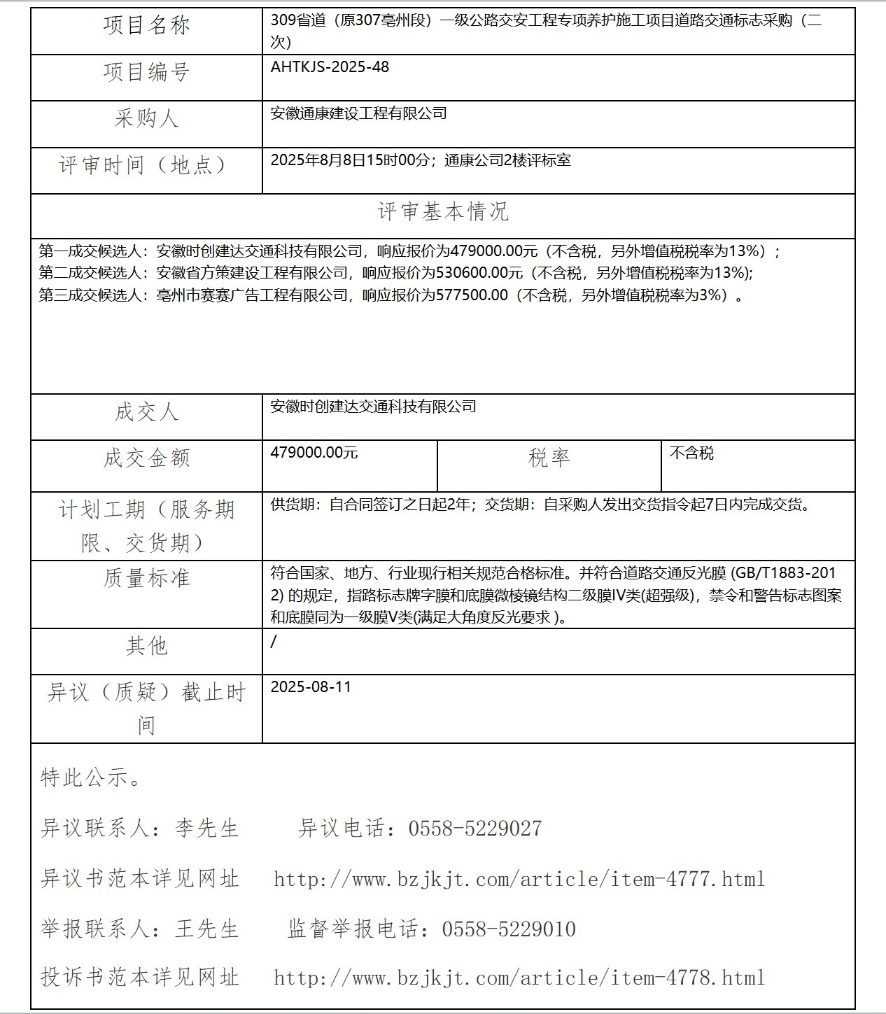 309省道(原307亳州段)一級公路交安工程專項養(yǎng)護施工項目道路交通標志采購(二次)成交結果公示