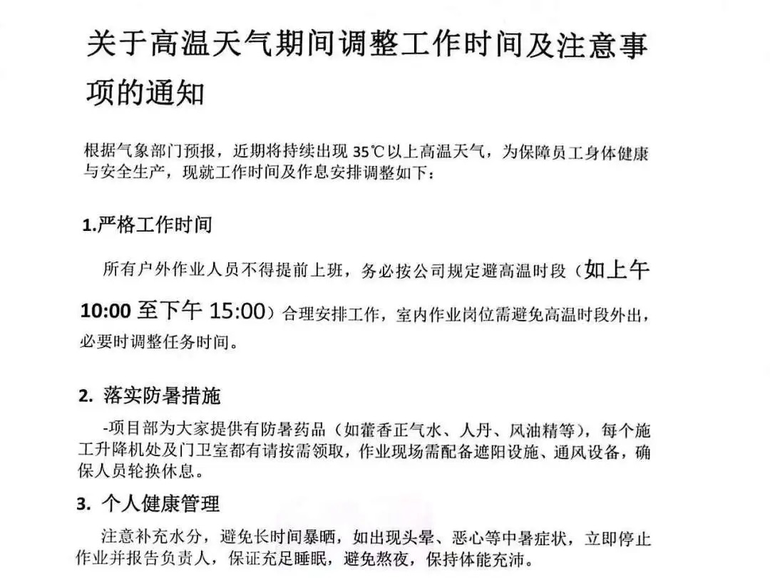 嚴(yán)格落實(shí)高溫天氣施工安全各項(xiàng)要求,指導(dǎo)各項(xiàng)目科學(xué)調(diào)整作業(yè)時(shí)間,全面推行“抓兩頭、歇中間”模式,剛性執(zhí)行高溫時(shí)段室外停工規(guī)定,嚴(yán)禁盲目搶趕工期,合理安排工序銜接,強(qiáng)化施工計(jì)劃管理,確保生產(chǎn)安全、有序推進(jìn)。
