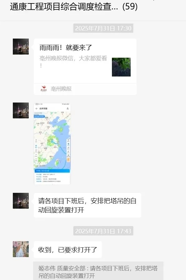 提前部署防汛工作,全面排查施工現(xiàn)場(chǎng)排水系統(tǒng)、臨時(shí)設(shè)施穩(wěn)固性及應(yīng)急物資儲(chǔ)備情況,對(duì)低洼易澇區(qū)域針對(duì)性落實(shí)防洪排澇措施,嚴(yán)格執(zhí)行24小時(shí)領(lǐng)導(dǎo)帶班和專人值班制度,密切跟蹤氣象預(yù)警和雨情水情信息,確保信息暢通、響應(yīng)迅速、防范有效。
