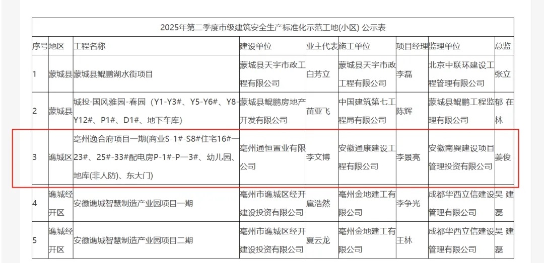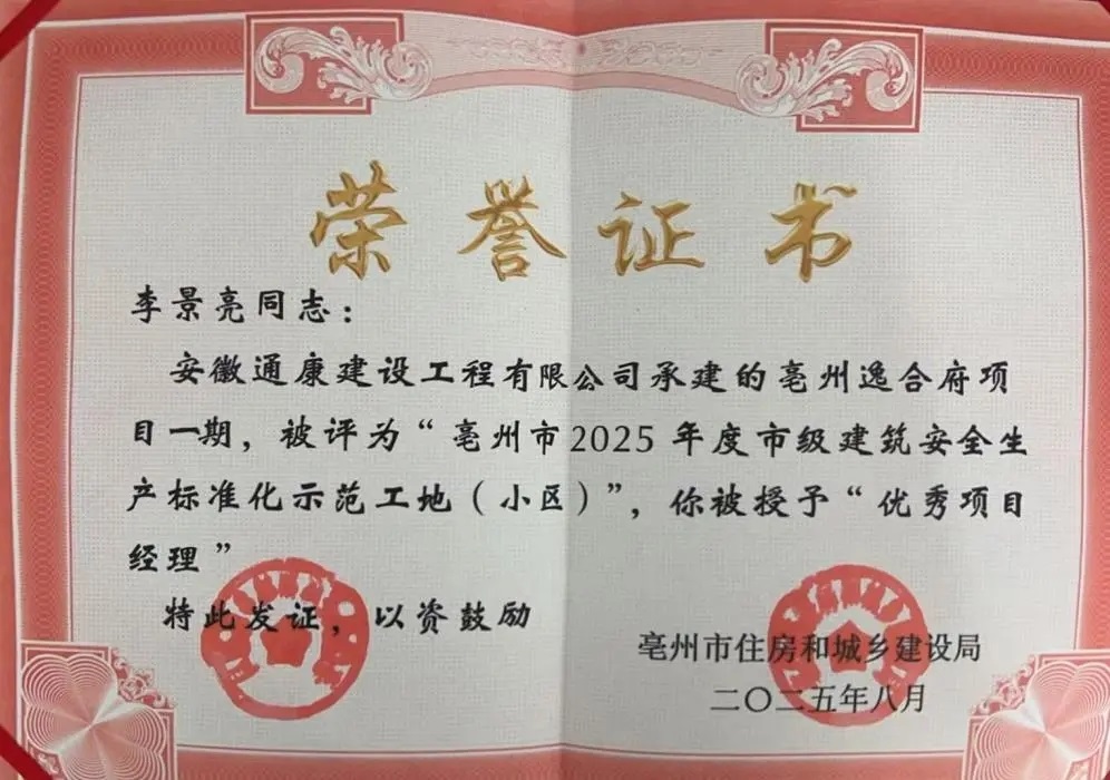 近日,由通康公司承建的亳州逸合府項目一期工程榮獲“2025年第二季度市級建筑安全生產(chǎn)標準化示范工地(小區(qū))”榮譽稱號,李景亮同志榮獲“優(yōu)秀項目經(jīng)理”榮譽稱號。