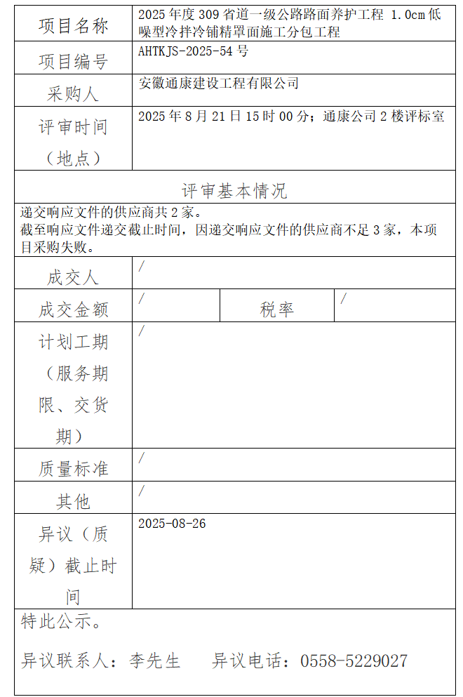 2025年度309省道一級公路路面養(yǎng)護工程1.0cm低噪型冷拌冷鋪精罩面施工分包工程成交結(jié)果公示
