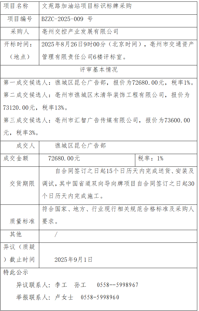 文苑路加油站項目標識標牌采購成交結(jié)果公示