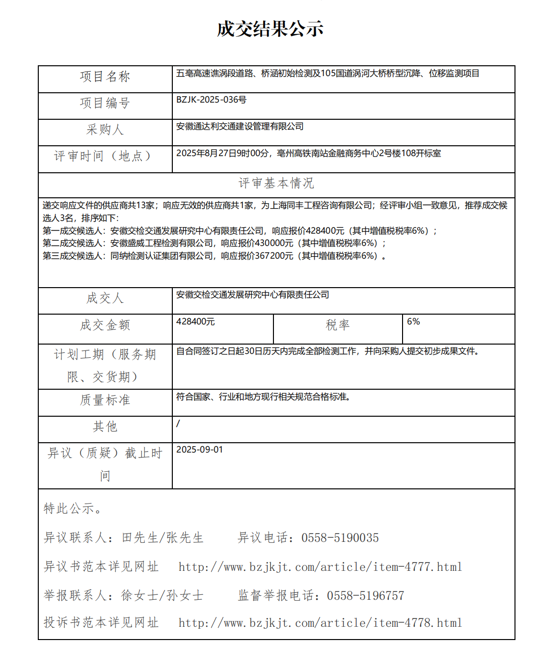 五亳高速譙渦段道路、橋涵初始檢測(cè)及105國(guó)道渦河大橋橋型沉降、位移監(jiān)測(cè)項(xiàng)目成交結(jié)果公示