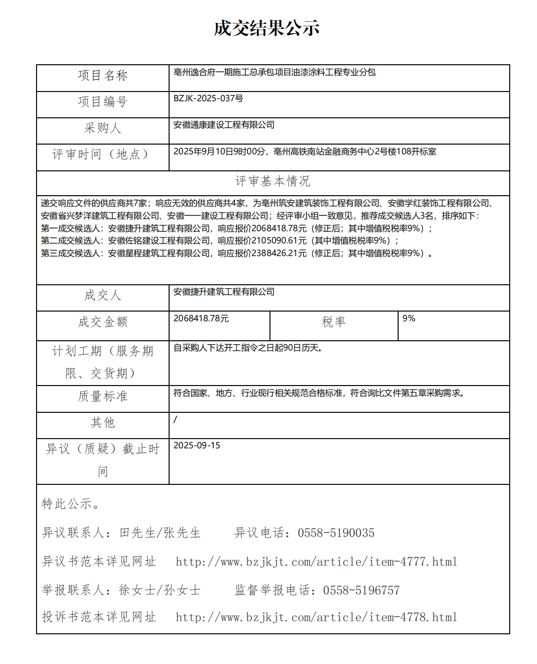 亳州逸合府一期施工總承包項(xiàng)目油漆涂料工程專(zhuān)業(yè)分包成交結(jié)果公示