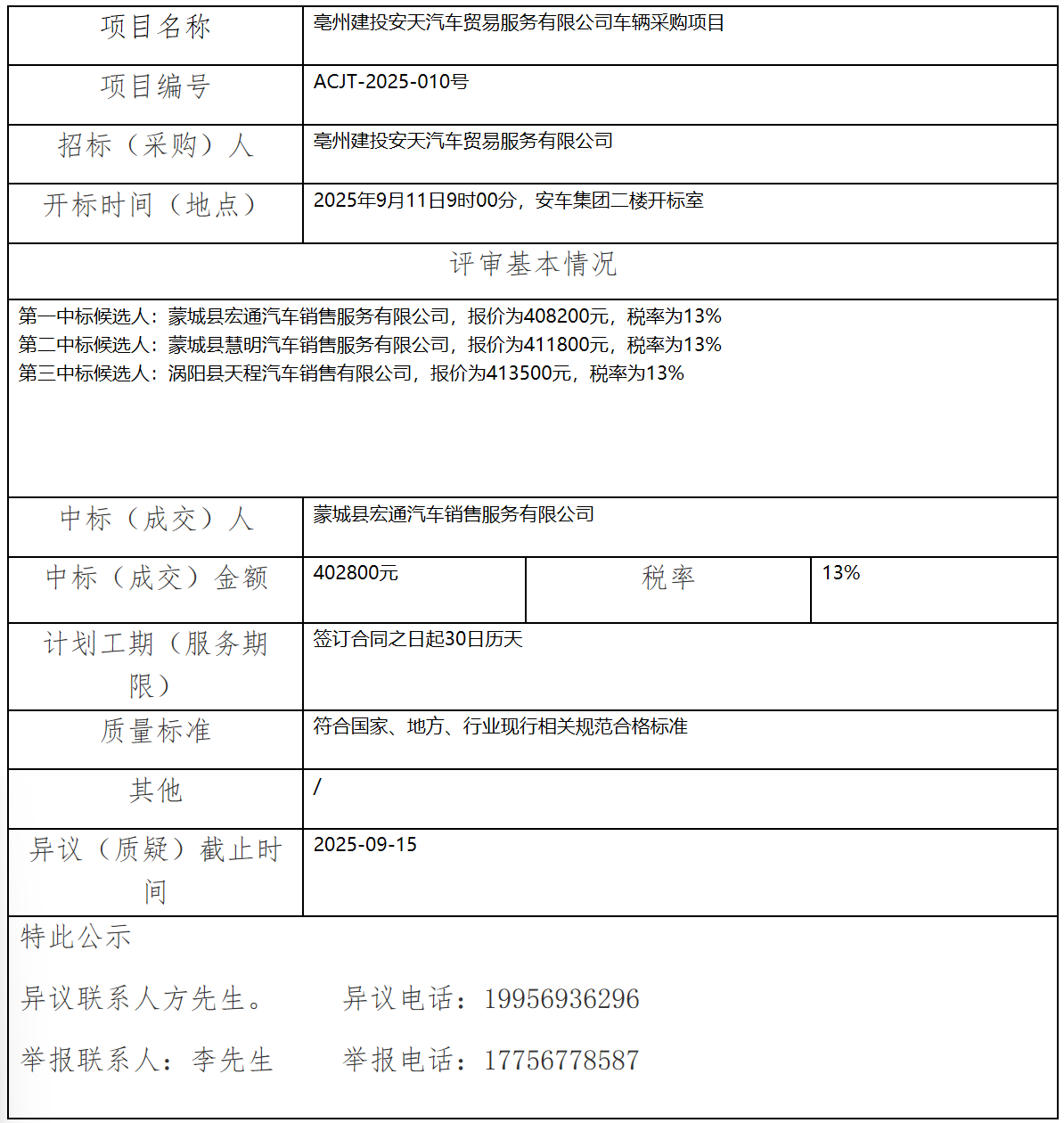 亳州建投安天汽車貿(mào)易服務(wù)有限公司車輛采購項目中標(成交)結(jié)果公示