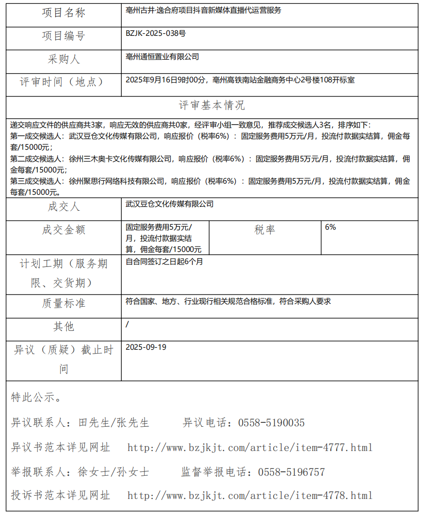 亳州古井·逸合府項(xiàng)目抖音新媒體直播代運(yùn)營服務(wù)成交結(jié)果公示