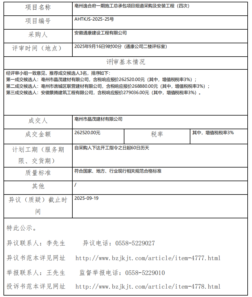 亳州逸合府一期施工總承包項目煙道采購及安裝工程(四次)成交結(jié)果公示