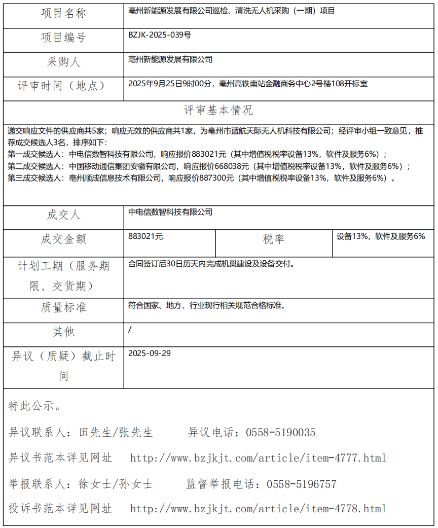 亳州新能源發(fā)展有限公司巡檢、清洗無人機采購(一期)項目成交結(jié)果公示
