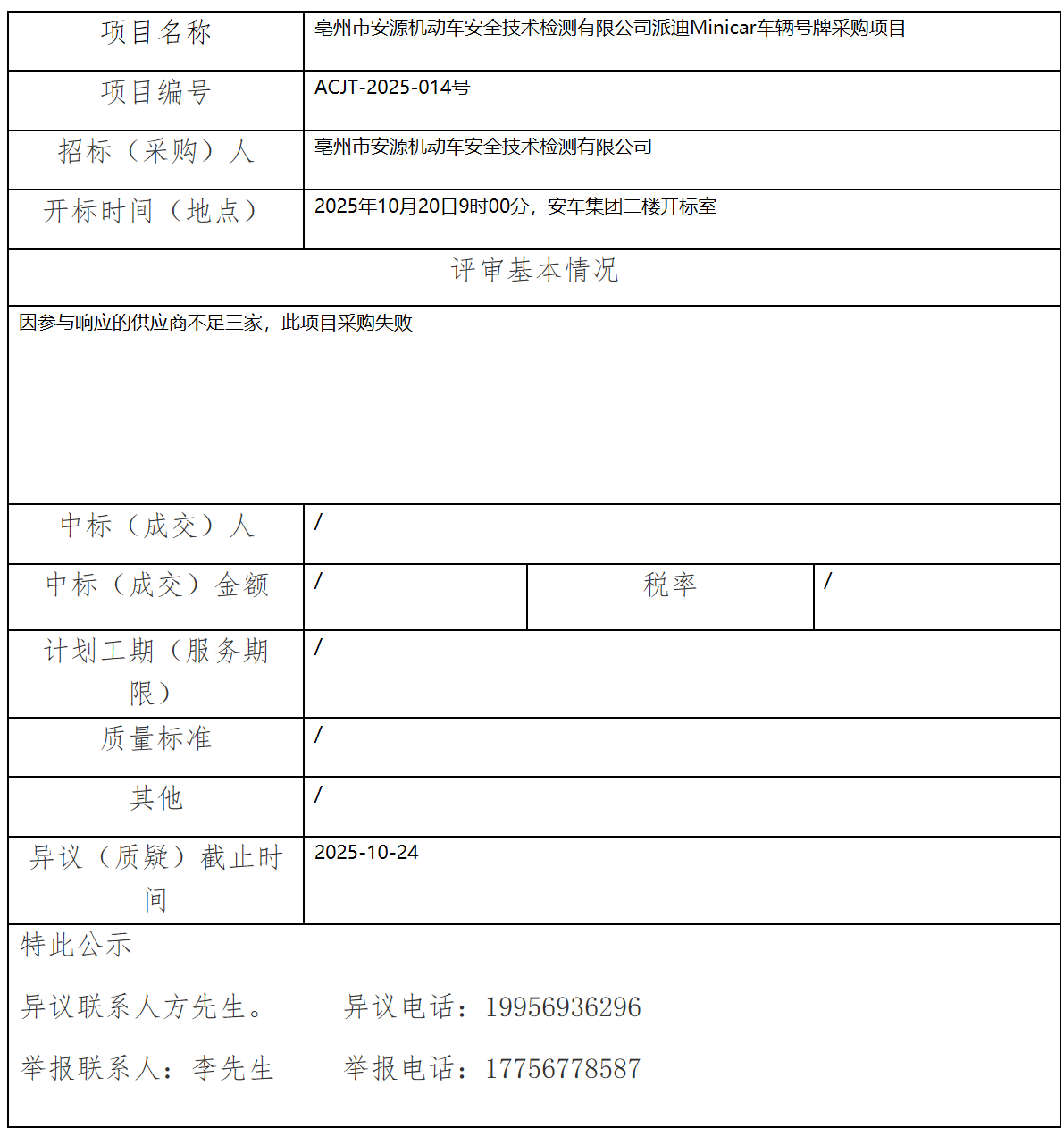 亳州市安源機(jī)動車安全技術(shù)檢測有限公司派迪Minicar車輛號牌采購項目中標(biāo)(成交)結(jié)果公示