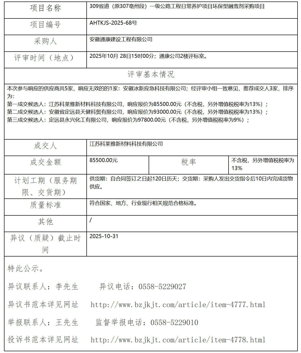 309省道(原307亳州段)一級公路工程日常養(yǎng)護(hù)項(xiàng)目環(huán)保型融雪劑采購項(xiàng)目成交結(jié)果公示