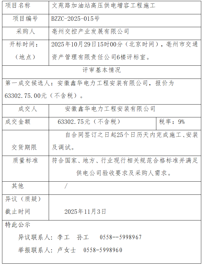 文苑路加油站高壓供電增容工程施工成交結(jié)果公示
