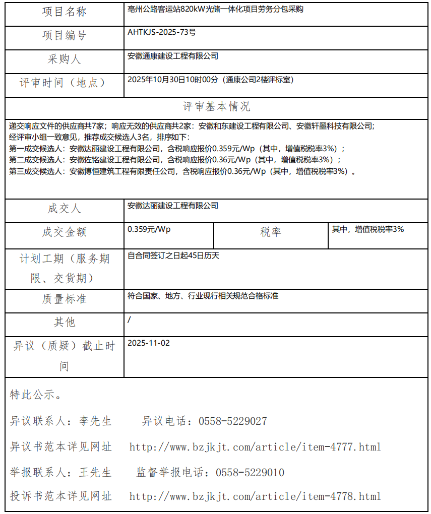 亳州公路客運(yùn)站820kW光儲(chǔ)一體化項(xiàng)目勞務(wù)分包采購成交結(jié)果公示