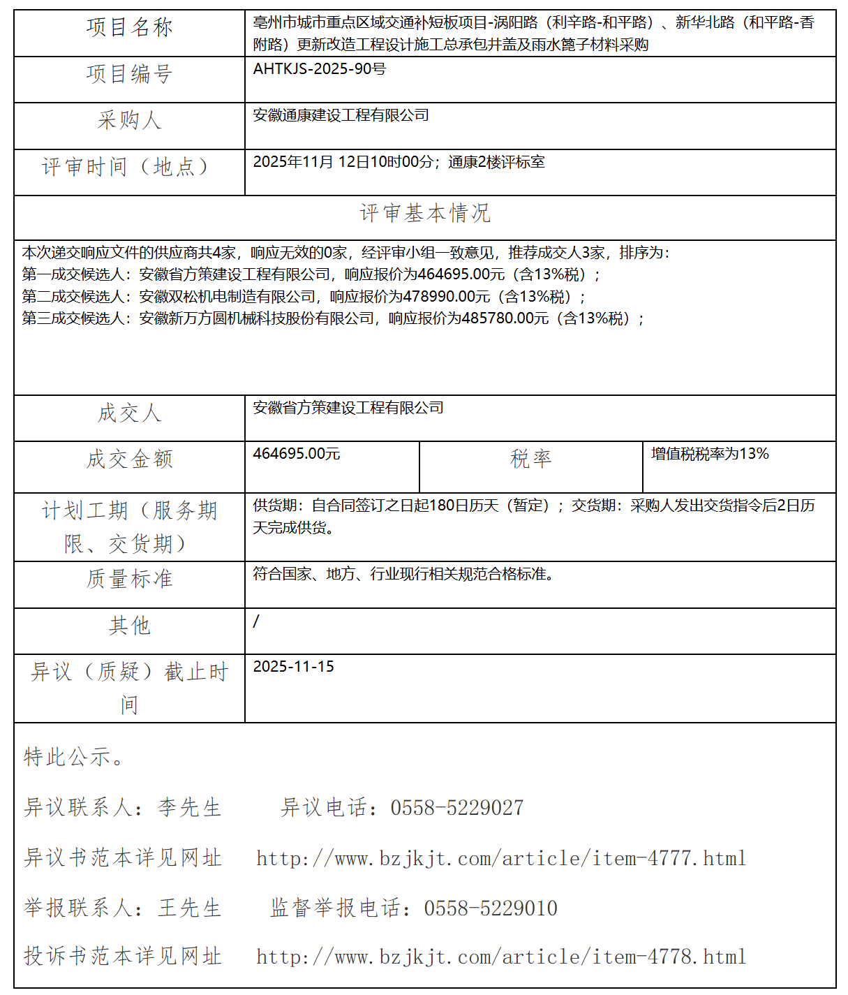 亳州市城市重點(diǎn)區(qū)域交通補(bǔ)短板項(xiàng)目-渦陽(yáng)路(利辛路-和平路)、新華北路(和平路-香附路)更新改造工程設(shè)計(jì)施工總承包井蓋及雨水篦子材料采購(gòu)成交結(jié)果公示