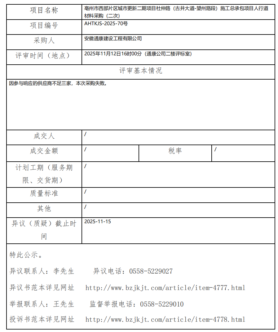 亳州市西部片區(qū)城市更新二期項目杜仲路(古井大道-望州路段)施工總承包項目人行道 材料采購(二次)成交結果公示