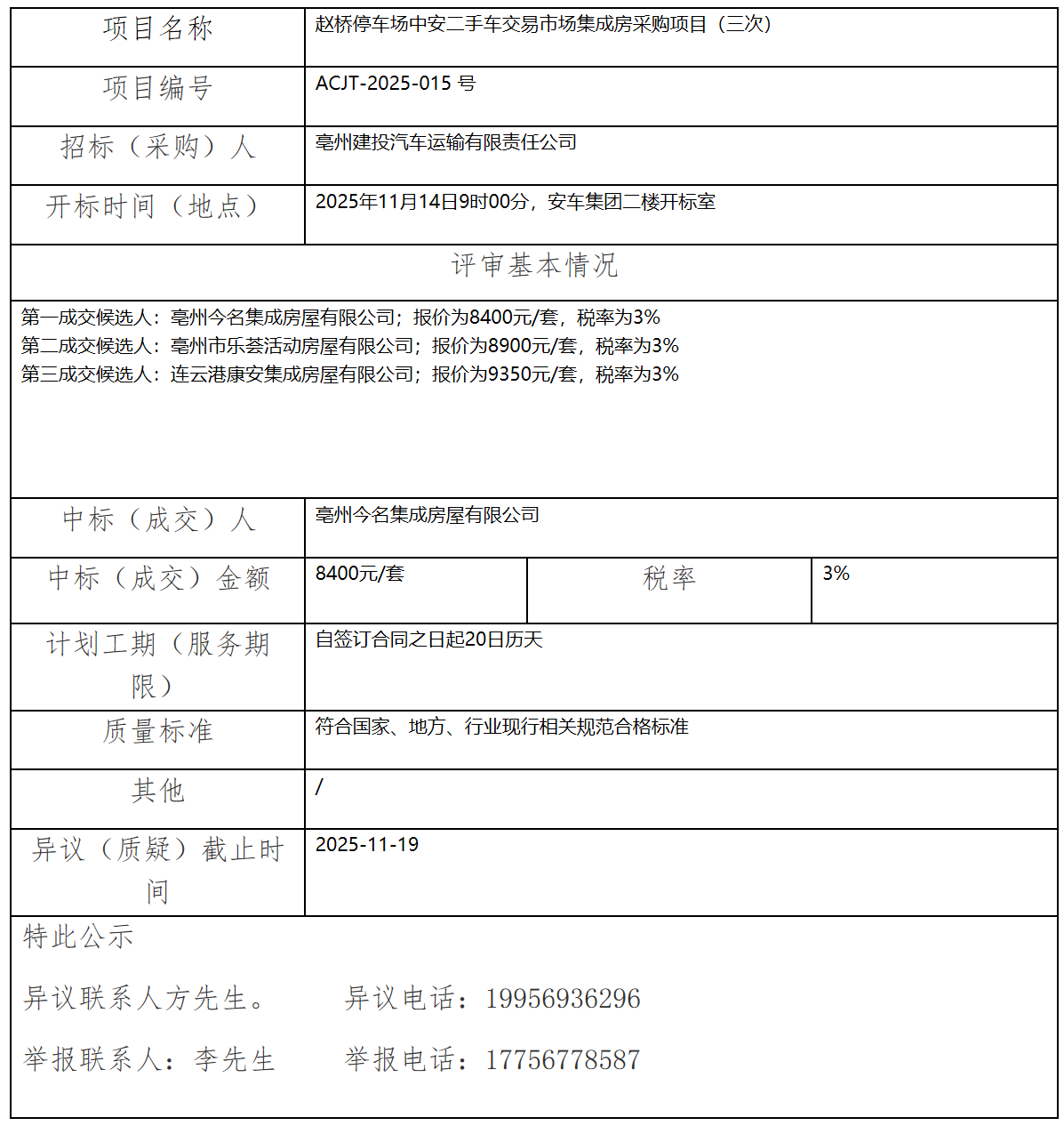 趙橋停車場(chǎng)中安二手車交易市場(chǎng)集成房采購(gòu)項(xiàng)目(三次)中標(biāo)(成交)結(jié)果公示