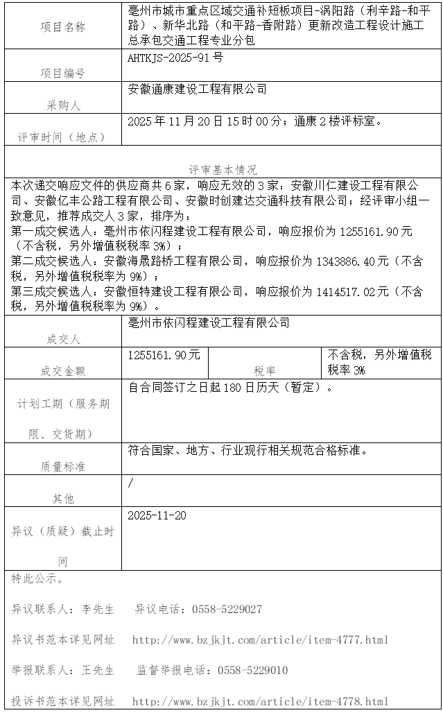 亳州市城市重點區(qū)域交通補短板項目-渦陽路(利辛路-和平路)、新華北路(和平路-香附路)更新改造工程設(shè)計施工總承包交通工程專業(yè)分包成交結(jié)果公示