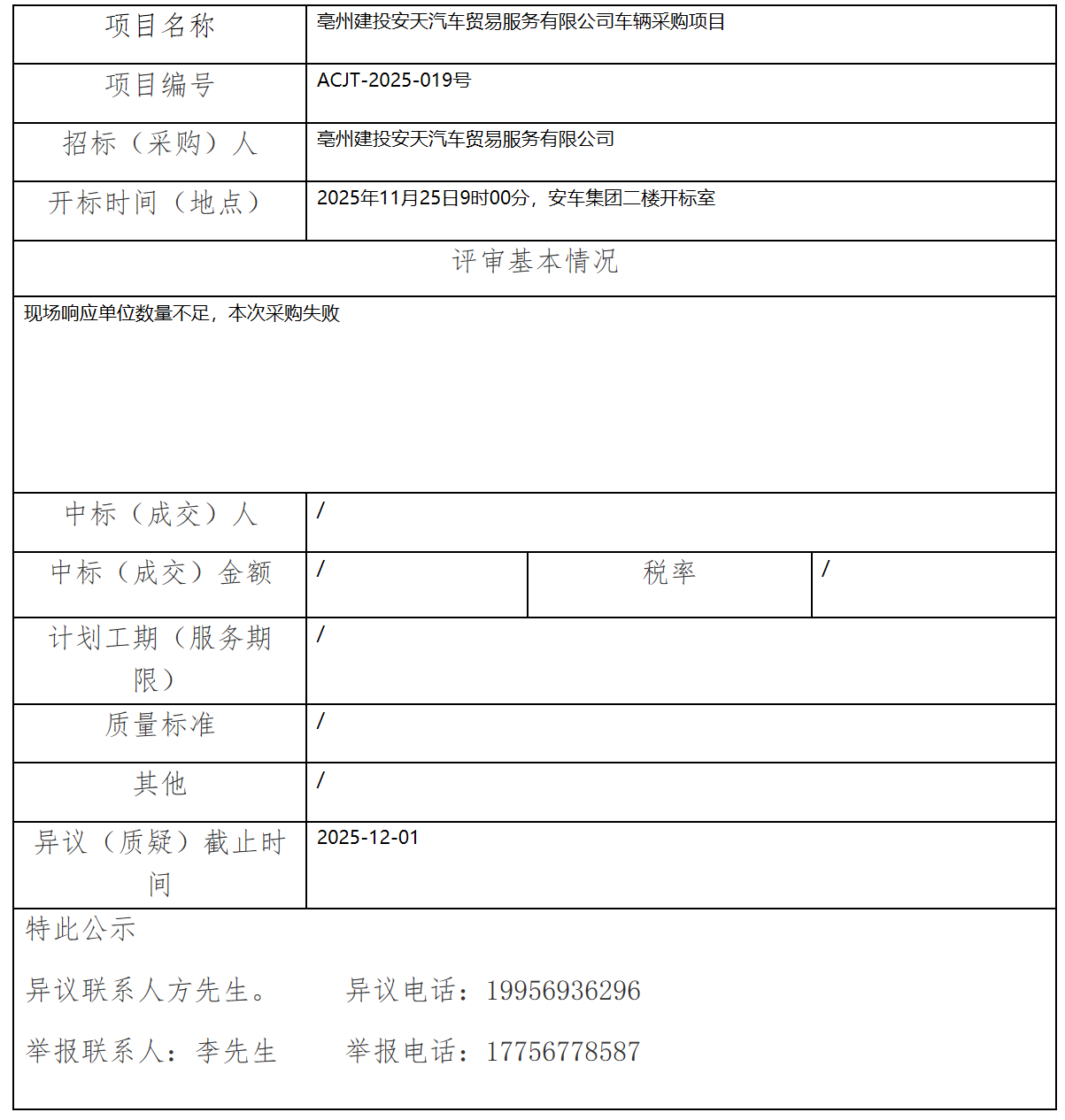 亳州建投安天汽車貿(mào)易服務(wù)有限公司車輛采購項目中標(biāo)(成交)結(jié)果公示
