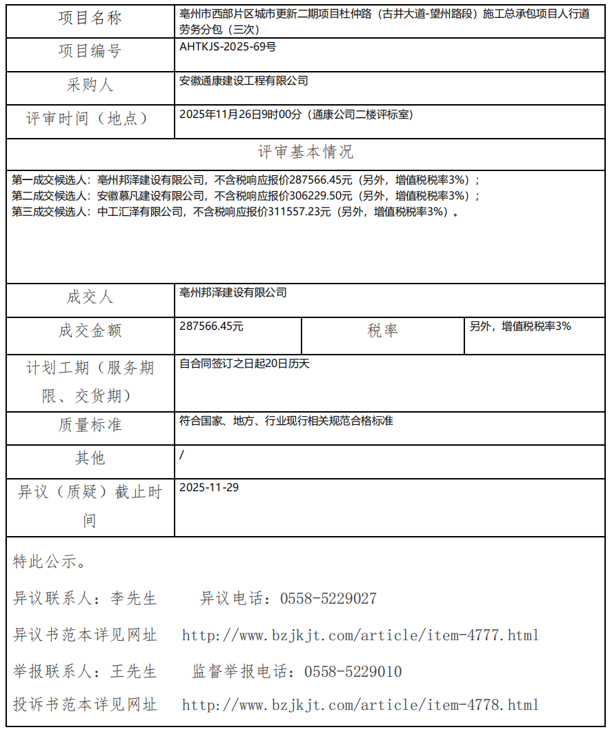 亳州市西部片區(qū)城市更新二期項(xiàng)目杜仲路(古井大道-望州路段)施工總承包項(xiàng)目人行道勞務(wù)分包(三次)成交結(jié)果公示