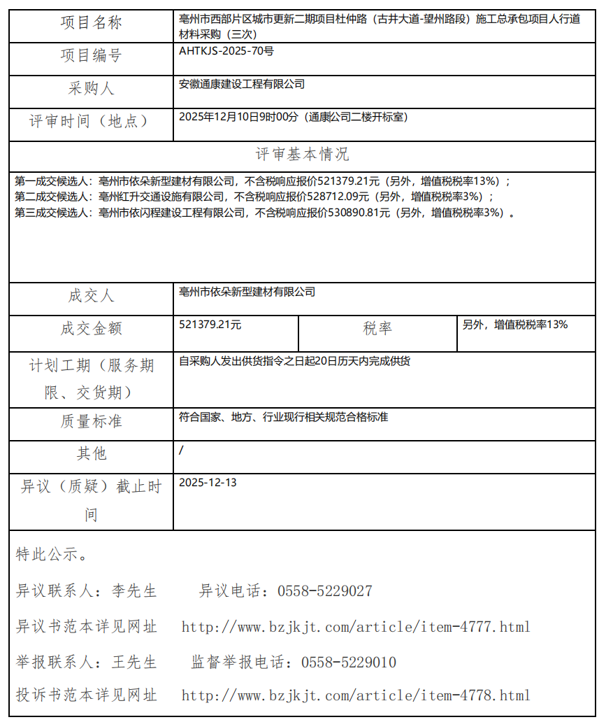 亳州市西部片區(qū)城市更新二期項目杜仲路(古井大道-望州路段)施工總承包項目人行道 材料采購(三次)成交結果公示