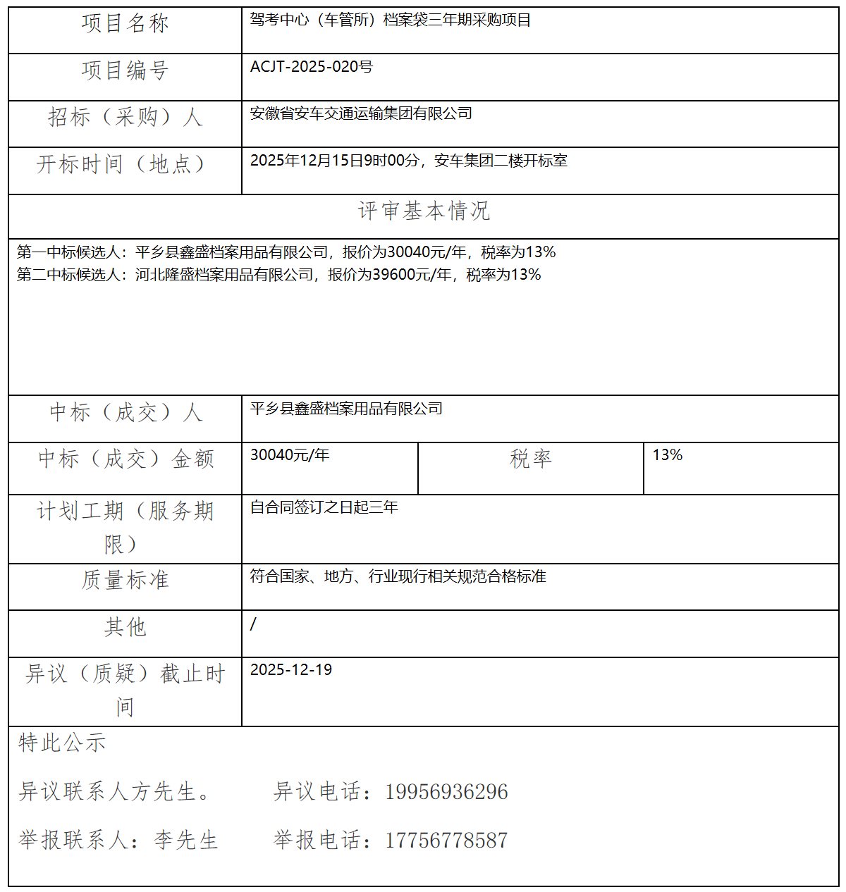 駕考中心(車管所)檔案袋三年期采購(gòu)項(xiàng)目成交結(jié)果公示